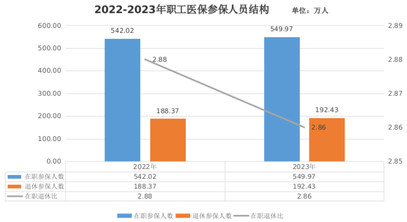 1.参保人数。截至2023年底,职工基本医疗保险(以下简称职工医保)参保742.40万人,比上年增加12.01万人,增长1.64%,其中,在职职工549.97万人,比上年增长1.47%;退休职工192.43万人,比上年增长2.16%,在职退休比为2.86。