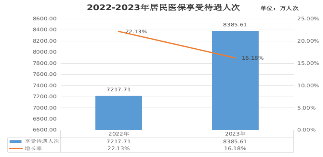 3.待遇享受。2023年,参加居民医保人员享受待遇8385.61万人次,比上年增长16.18%。其中,普通门急诊5967.77万人次,门诊慢特病1366.71万人次,住院1051.12万人次。次均住院费用6048元,其中,在三级、二级、一级及以下医疗机构(含未定级)的次均住院费用分别为11224元、5541元、2282元。居民医保参保人员住院率为23.78%,次均住院床日7.8天。