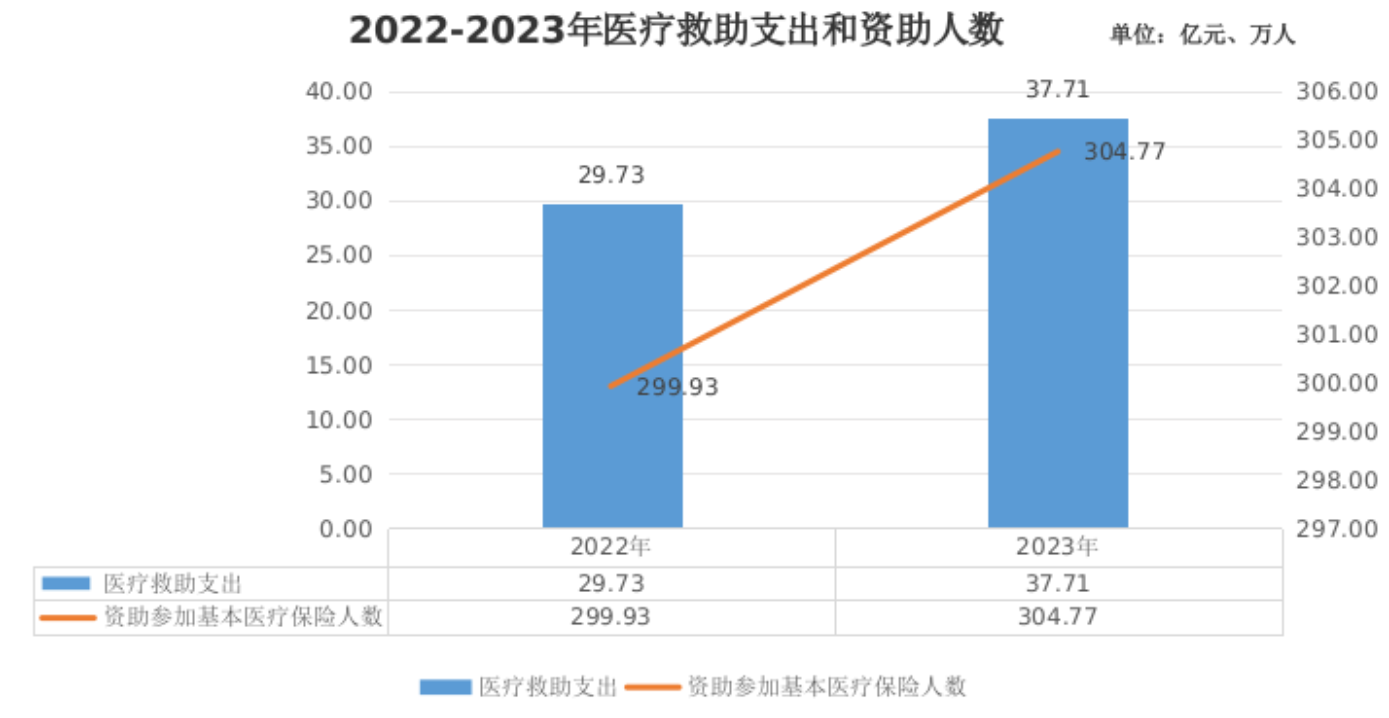 2023年,全区医疗救助支出37.71亿元,医疗救助基金资助304.77万人参加基本医疗保险,实施门诊和住院救助524.99万人次,全区次均住院救助、门诊救助分别为1382元、120元。2023年,中央财政安排医疗救助补助资金21.59亿元。(备注:医疗救助基金资助参保人数不含其他部门资助参保人数。)