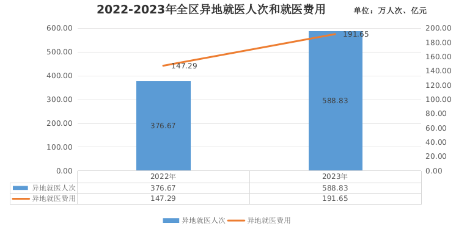 2023年,全区普通门急诊、门诊慢特病及住院异地就医588.83万人次,其中,职工医保异地就医341.74万人次(包括省内异地就医305.82万人次,省外异地就医35.91万人次),居民医保异地就医247.09万人次(包括省内异地就医202.59万人次,省外异地就医44.49万人次)。全区普通门急诊、门诊慢特病及住院异地就医费用191.65亿元,其中,职工医保异地就医费用59.99亿元,居民医保异地就医费用131.66亿元。