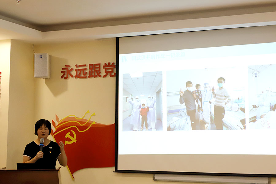 活动还聆听了肿瘤医院医疗队援鄂抗疫英雄先进事迹。 援鄂抗疫医疗队临危不惧、义无反顾、逆行出征,冲在疫情防控第一线,以生命守护生命,为打赢疫情防控阻击战作出了重要贡献。在场人员都为之深深感动,并致以了最热烈的掌声。