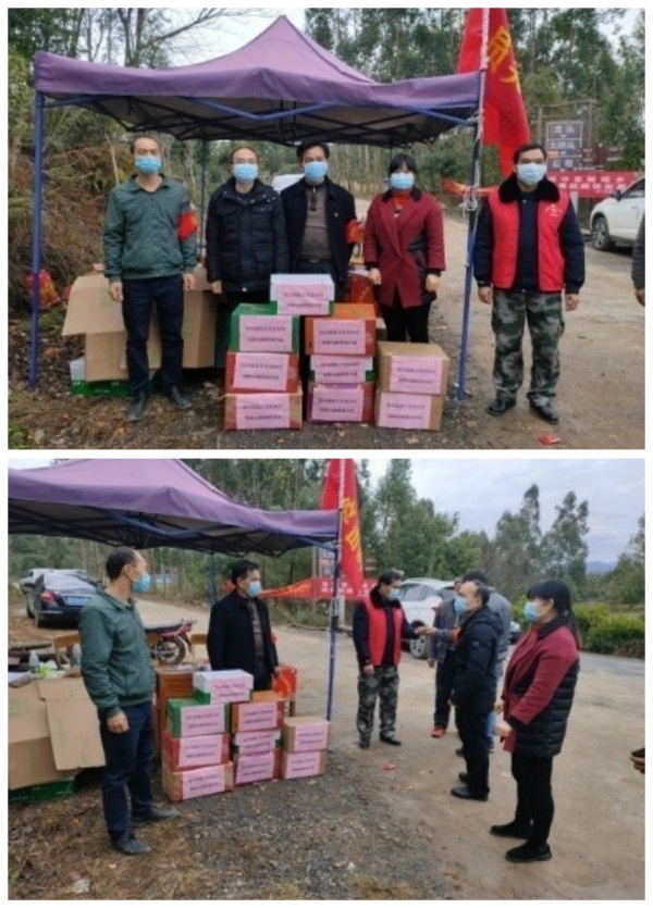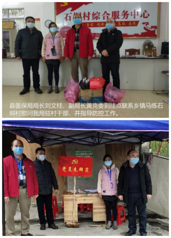 石坝村是富川瑶族自治县医疗保障局的定点帮扶村,淳朴的村民喜欢聚集在代销店等场所,为将防疫工作延伸到每家每户,筑牢疫情防控战线,村委在村口设立了疫情防控卡点,加强管控。县医保局作为后盾单位,工作之余,党员代表陈有群、李春翠前往防控点,了解当地的防疫工作情况,向当地人民群众解读医保报销政策,叮嘱工作队员在做好工作的同时,也要做好自身防控,还为值班驻守的工作人员送去烤火碳、泡面、矿泉水、面包等物资,表达后盾单位的关怀。他们总说“面对疫情,再苦再累我们不感觉辛苦,作为党员,我们肩负守护人民的责任和使命。”