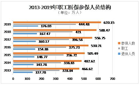 1.参保人数持续增长。2019年,全区参加职工医保620.51万人,比上年增长5.44%。其中在职职工444.48万人,比上年增长5.58%;退休职工176.03万人,比上年增长5.11%。在职退休比为2.53,同比略微上升。