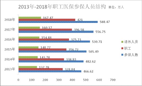 1.参保人数平稳增长。2018年,全区参加职工医保588.47万人,比上年增长5.7%。其中在职职工421万人,比上年增长6.16%;退休职工167.47万人,比上年增长4.56%。在职退休比为2.51,同比略微上升。