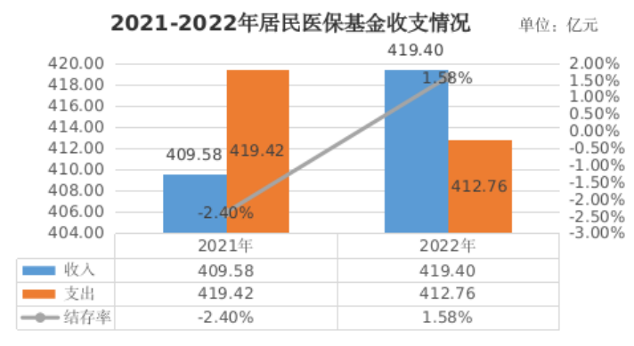 2.基金收支。2022年,居民医保基金收入419.40亿元,比上年增长2.4%;基金支出412.76亿元,比上年下降1.59%;居民医保基金当期结存6.64亿元,累计结存407.13亿元。